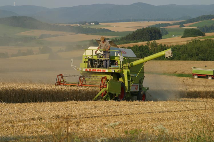 Ernteeinsatz auf dem "Hiersebleek", in Hintergrund rechts "Zandersberg" Mähdrescher / Fahrer = Rudi Große (Aufnahmedatum: August 2004)