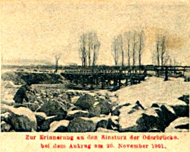 Historische Postkarte zum Einsturz der Oderbrücke im Jahr 1902