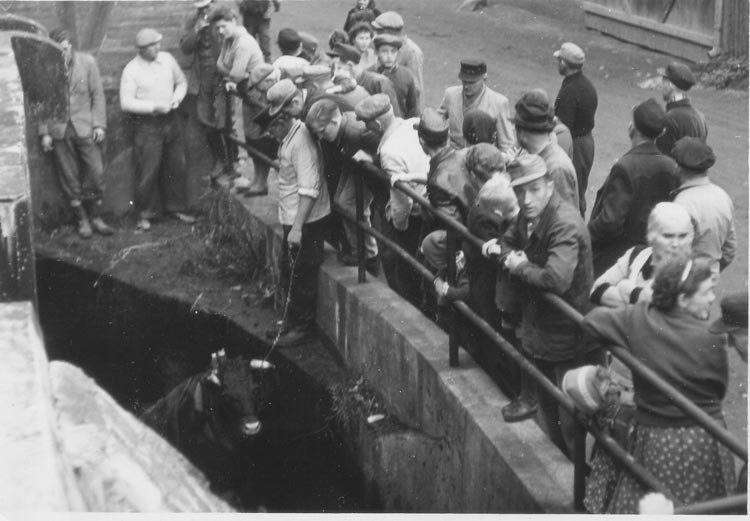 Historische Aufnahme: "Kuh im Mühlengraben" Aufnahme von Willi Kaschewski, Aufnahmedatum: 29.10.1958